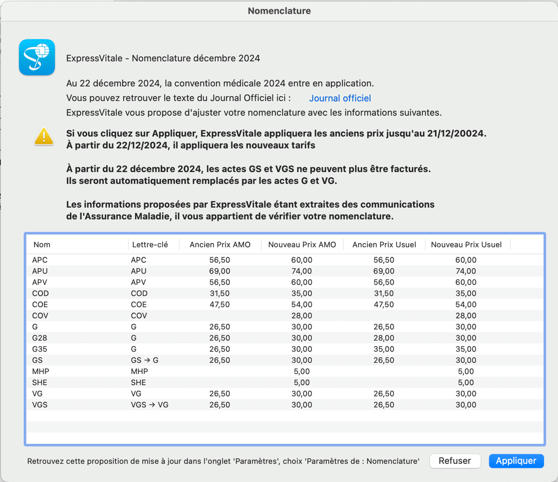 Une mise à jour d’ExpressVitale est prévue le mercredi 18 décembre au soir pour application automatique des nouveaux tarifs le 22 décembre. Une fois la mise à jour installée automatiquement, à son premier lancement, ExpressVitale proposera à l’utilisateur métropolitain la fenêtre suivante (elle s’adaptera pour les utilisateurs des DOM) :